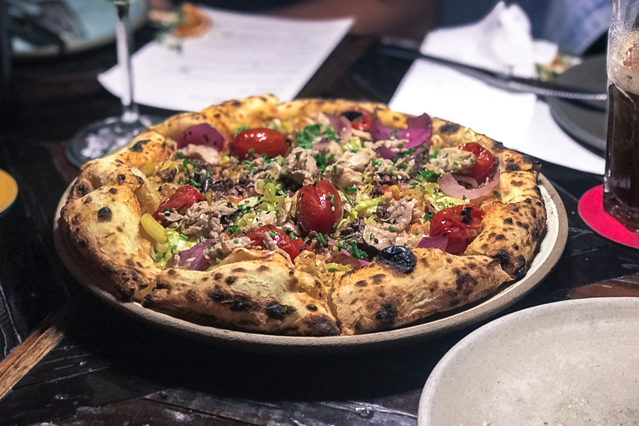 Depois foi a vez da Tuna (R$49,00). Mais uma vez o nome já denuncia o ingrediente principal: atum fresco. Mas ele não vem sozinho, além de ser assado na lenha, é acompanhado por alho poró, cebola roxa, tomate cereja, pesto de azeitona, e raspas de limão. Nos surpreendeu, muito saborosa.