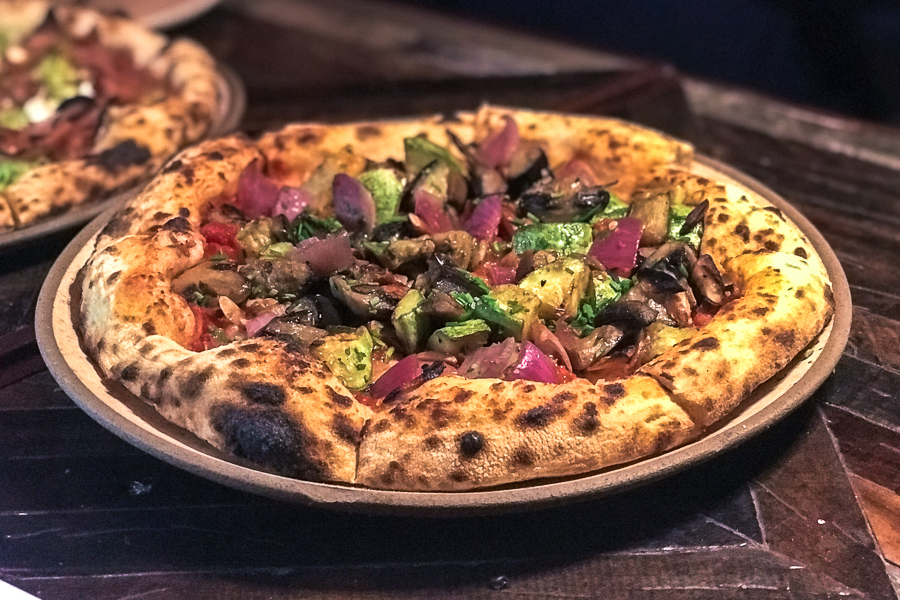 Em primeiro lugar provamos a Caponata (R$41,00 – as pizzas são todas em tamanho individual). Como é de se imaginar a pizza é feita com berinjela, abobrinha, cebola, cogumelos, castanhas e ervas frescas. A saber, não leva queijo, sendo a pedida vegana da pizzaria Ella.