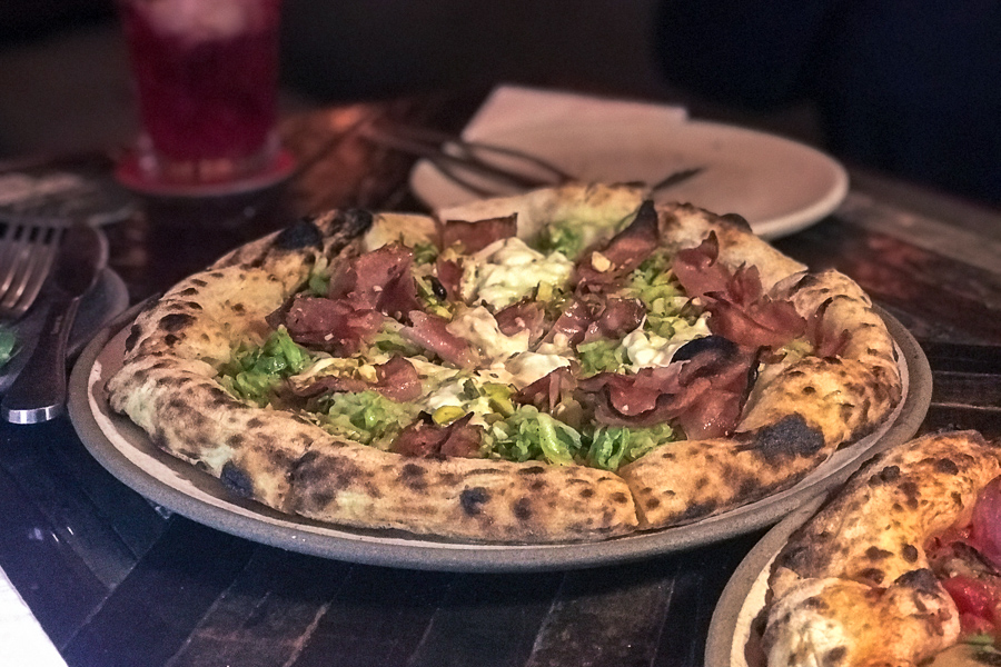 Por fim provamos a Italiana, feita com mortadela italiana (deliciosa!), abobrinha, straciatella de búfula, raspas de limão siciliano e pistache (R$46,00). Essa foi a nossa preferida dentre as 3.