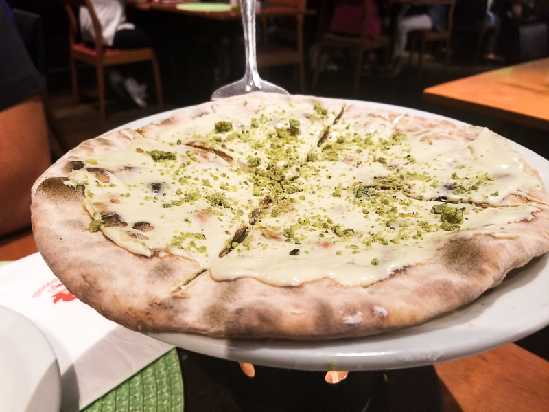 Para finalizar com chave de ouro experimentamos uma das pizzas doces da casa. São quatro opções de sabores disponíveis e nós escolhemos a de Chocolate Branco com Pistache (R$24,00; tamanho único).
