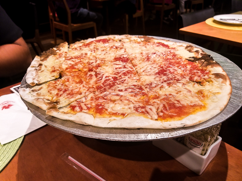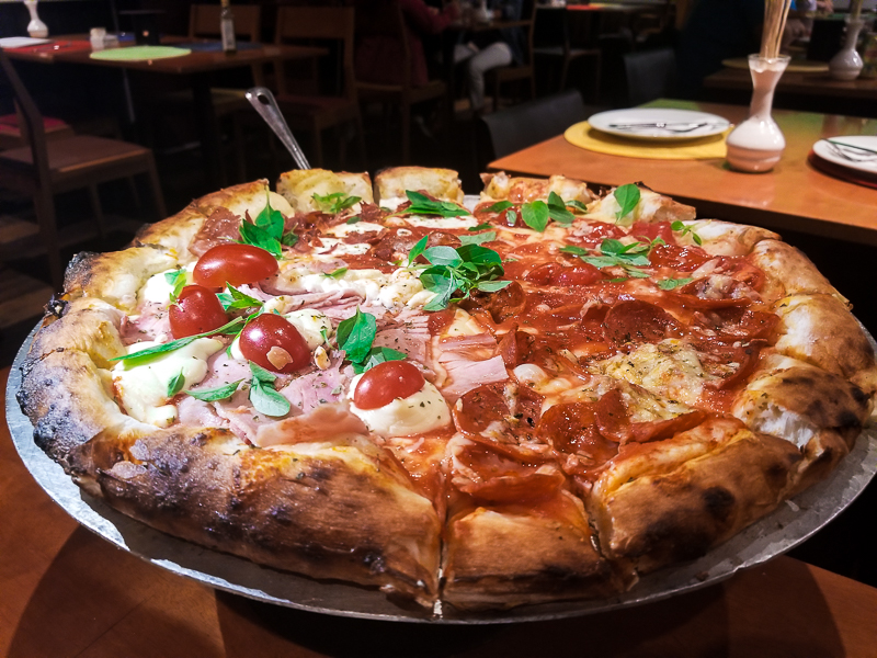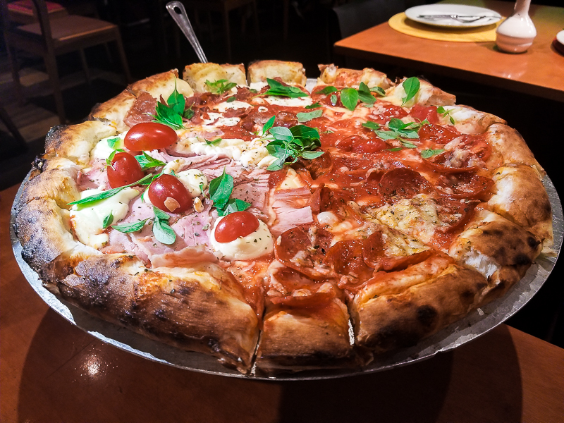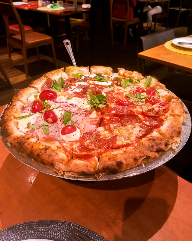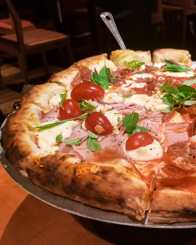 Em seguida fomos para a redonda. São duas opções de tamanho, a individual (I) e a grande (G). Pedimos uma pizza grande com 4 sabores diferentes, o máximo permitido. Foram eles: Presunto Royale (Mozzarella de cura especial, molho de tomate italiano, presunto royale, cream cheese, tomate cereja e manjericão; I-R$42 e G-R$85), Borghese (Molho de Tomate Italiano, mozzarella de cura especial, orégano, burrata cremosa, presunto Parma crocante e manjericão), Margherita Especial (mozzarella de búfula, molho de tomate italiano, tomate cereja temperado com azeite e folhas frescas de manjericão, gratinada com queijo parmesão; I-R$41 e G-R$84), Pepperoni (mozzarella de cura especial, molho de tomate italiano, pepperoni, gratinada com grana padano; I-R$40 G-R$79).