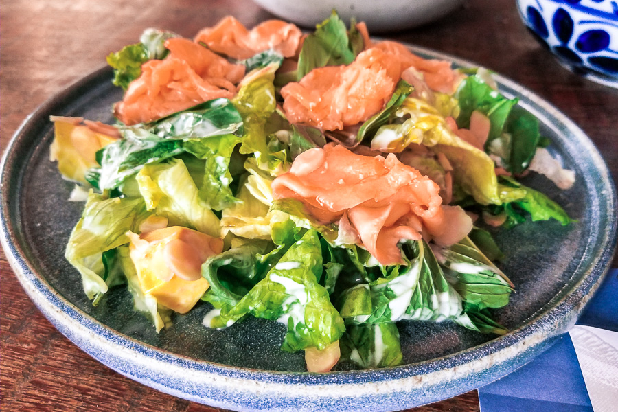 - A refrescante Salada Verde com abacate, Amêndoas Laminadas, Tiras de Salmão Defumado tudo ao molho de iogurte e hortelã (R$42,00);