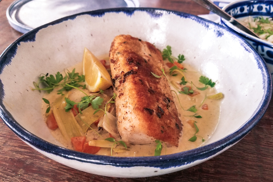 Salmão Grelhado - Peixe do dia em Crosta de Ervas (R$62,00) com abobora e alho poró em molho de parmesão cremoso.