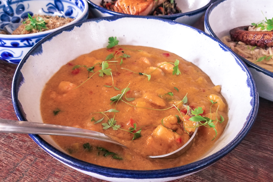 Polvo - Bobó de Camarão (R$138,00 para 2 pax.) com arroz de coco e farofa de castanha de caju.
