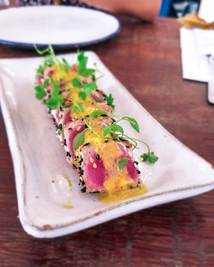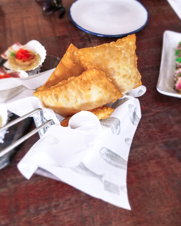 Pastel de Camarão - Sashimi de Atum selado (R$38,00) – com um belo toque thai de molho curry e crosta de gergelim. Muito bom.