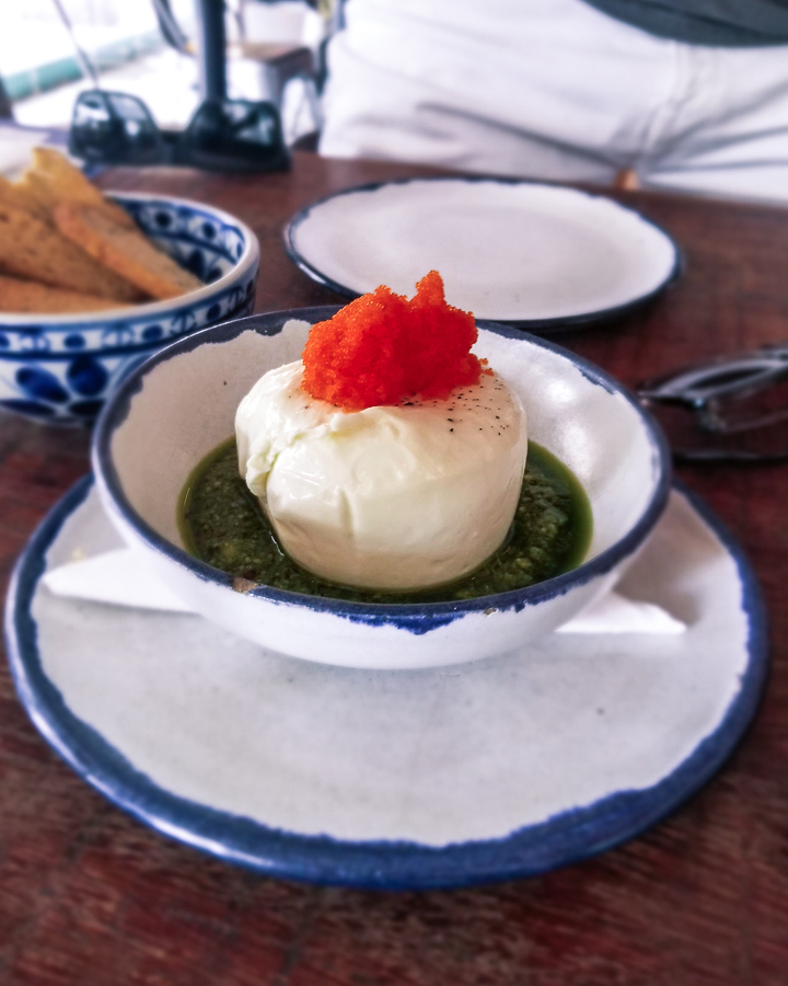 Sashimi de Atum - Burrata de Pesto de Manjericão e Ovas Massago Orange (R$56,00) – que delícia essa combinação! Acompanha torradas também.