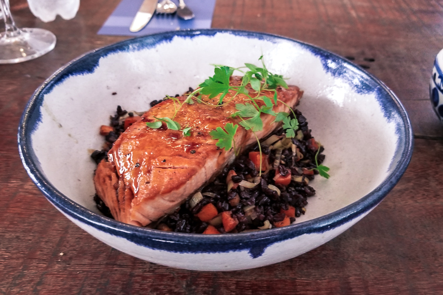 Salada Verde - Salmão Grelhado (R$64,00), com arroz negro refogado com vegetais e molho teriyaki.