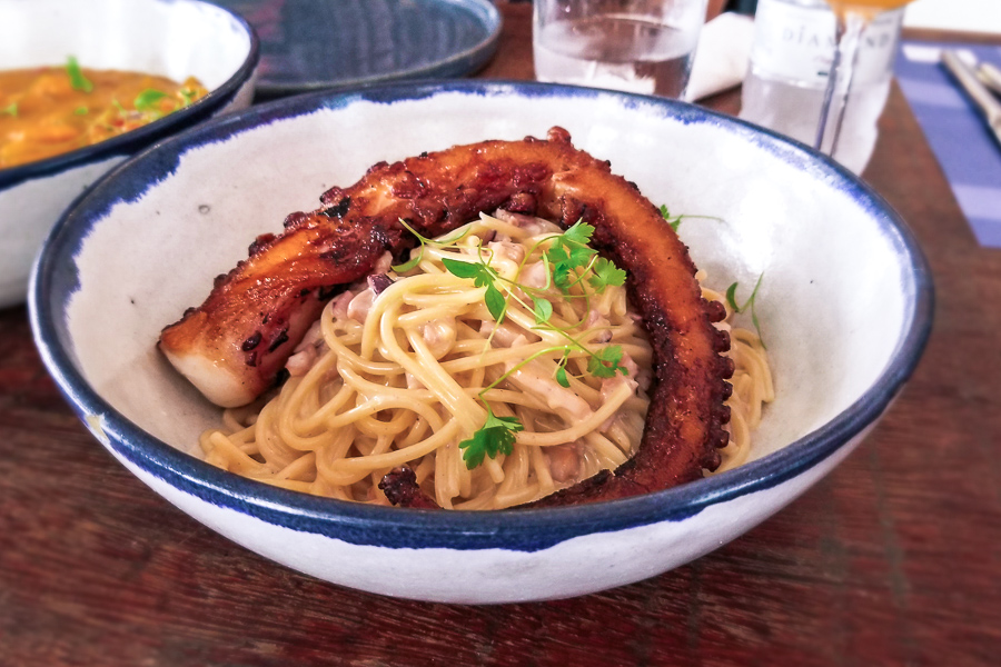 • Polvo Salteado no Azeite de Ervas (R$82,00) com espaguete ao molho cremoso de  polvo tostado.