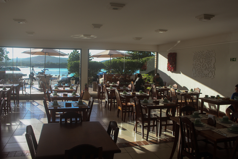 O salão do café da manhã é bem amplo, mas preferimos as mesas em frente ao canal, ao som dos pássaros e vendo os barquinhos passando.