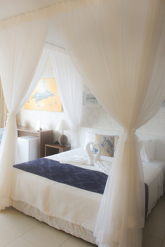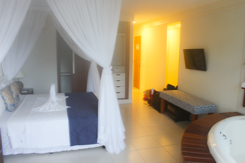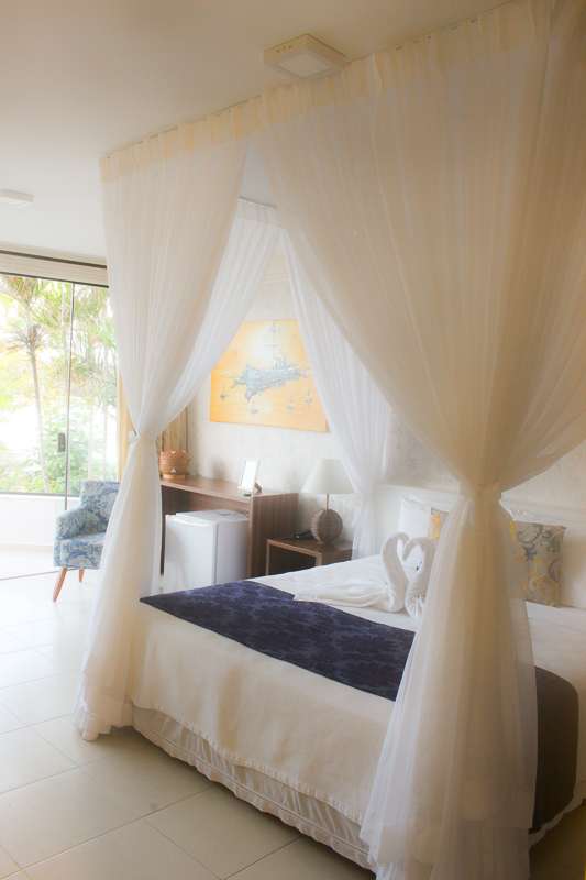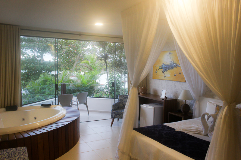 Ela possui 35 m² e conta com uma cama King Size com um charmoso mosquiteiro (parece aquelas camas de princesa!), TV LCD, armário grande, cofre, frigobar, ar condicionado Split, serviço de despertador, Internet wi-fi, telefone e uma varanda com um visual lindo.