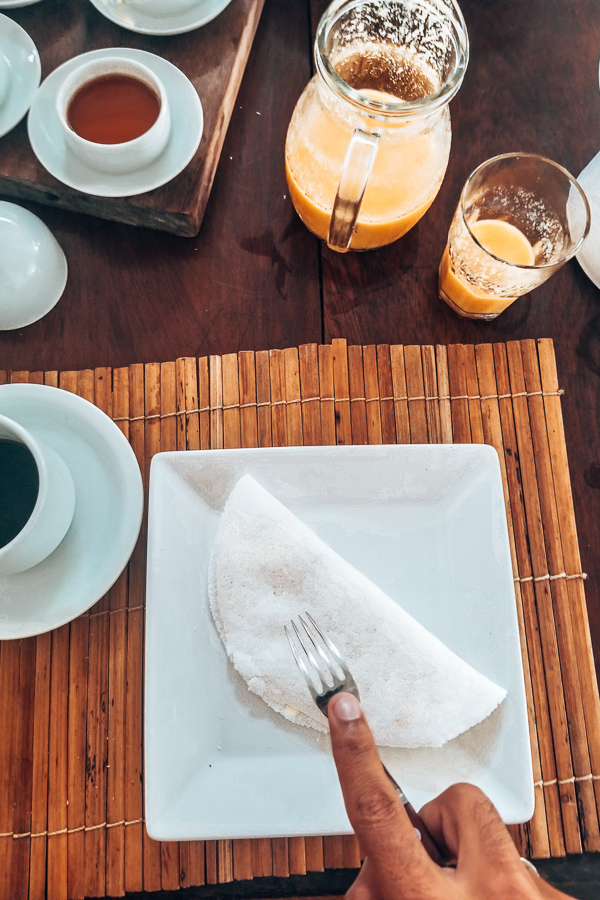 O café da manhã é servido na área principal da Pousada Lagoa Caraíva e em sistema a la carte. As maravilhas produzidas ali mesmo na cozinha deles são levadas até sua mesa. Tudo feito com muito carinho e de extrema qualidade. É um sonho esse café.