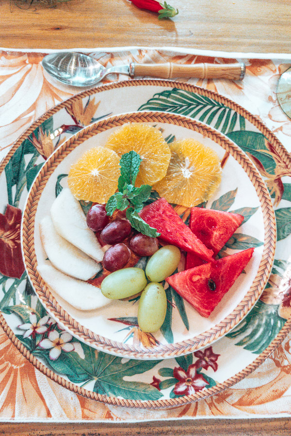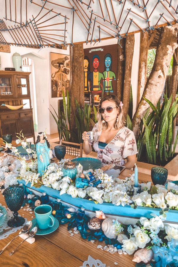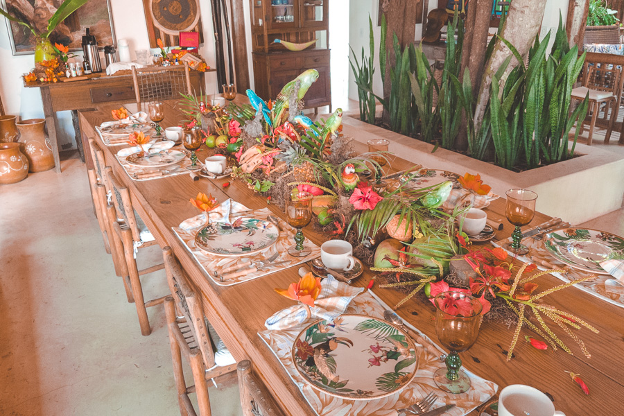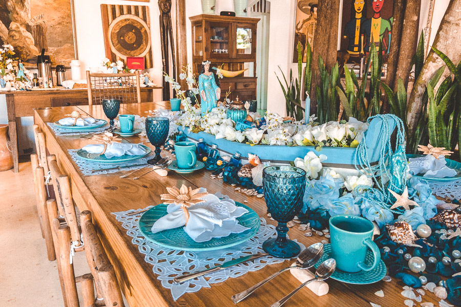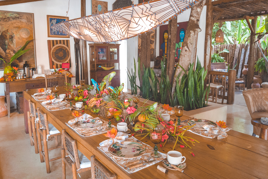 Não bastasse isso, o café da manhã é temático. E não satisfeitos em surpreender dessa maneira, eles não criaram somente um tema, mas são vários (a menos que passe mais de 10 dias lá você não irá repetir o tema do café!). Como ficamos 2 dias por lá experimentamos o tema “Vereda Tropical” e o tema “Oferendas a Iemanjá”. Tudo é decorado por eles mesmos momentos antes. Além do efeito visual, a degustação segue o tema também. Com pratos inspirados e criados para serem associados a mesa. Uma experiência sem igual, impressionante. Nunca vimos isso antes, e olha que já vimos de um tudo em termos de serviço de alta qualidade.