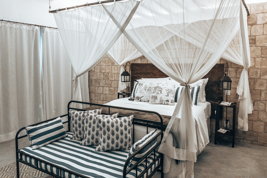 A suíte, que é a maior da pousada, conta ainda com TV, ar-condicionado, cofre, frigobar, escrivaninha, armários etc. O serviço se prova excepcional quando antes do check-in os colaboradores criam um grupo no whatsapp para atendê-los durante a estada. Uma espécie de personal concierge. Chegamos no quarto e já tinha um welcome lunch com nossas frutas preferidas, quarto climatizado, cheirinho delicioso, e música ambiente. Depois de pegar avião e carro nada melhor do que ser recebido assim. E a noite após voltar do passeio ou jantar, o turn down service faz a diferença. Pela manhã, uma bolsa de praia feita a mão com toalhas para você ir a praia.