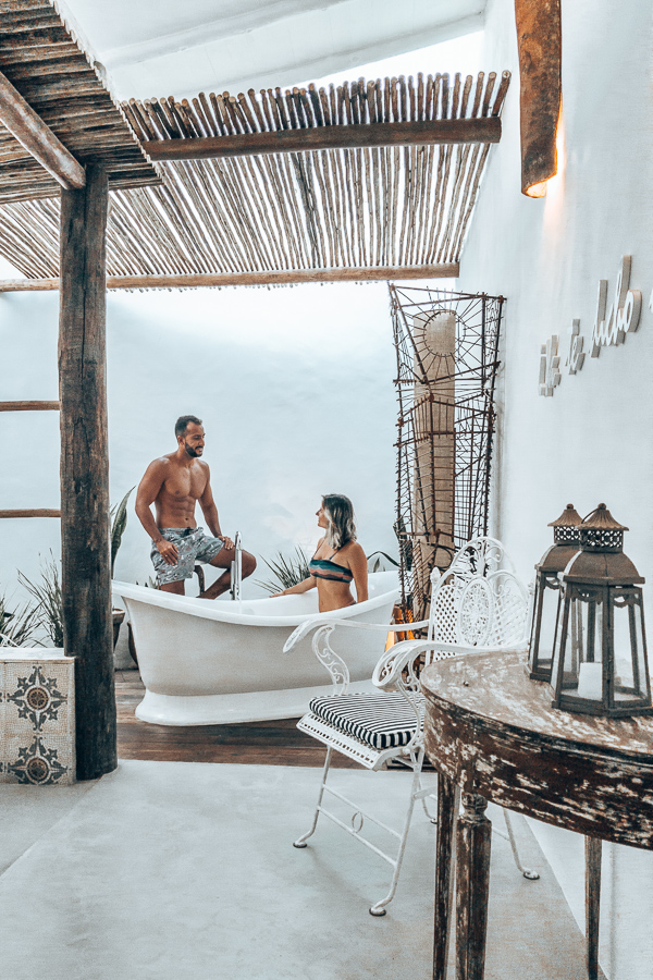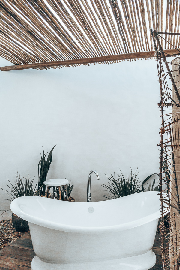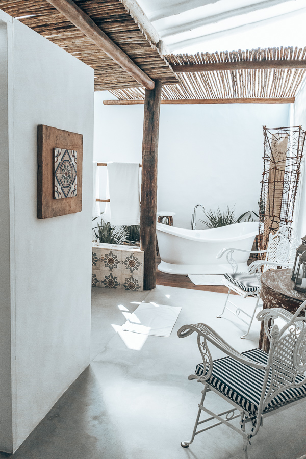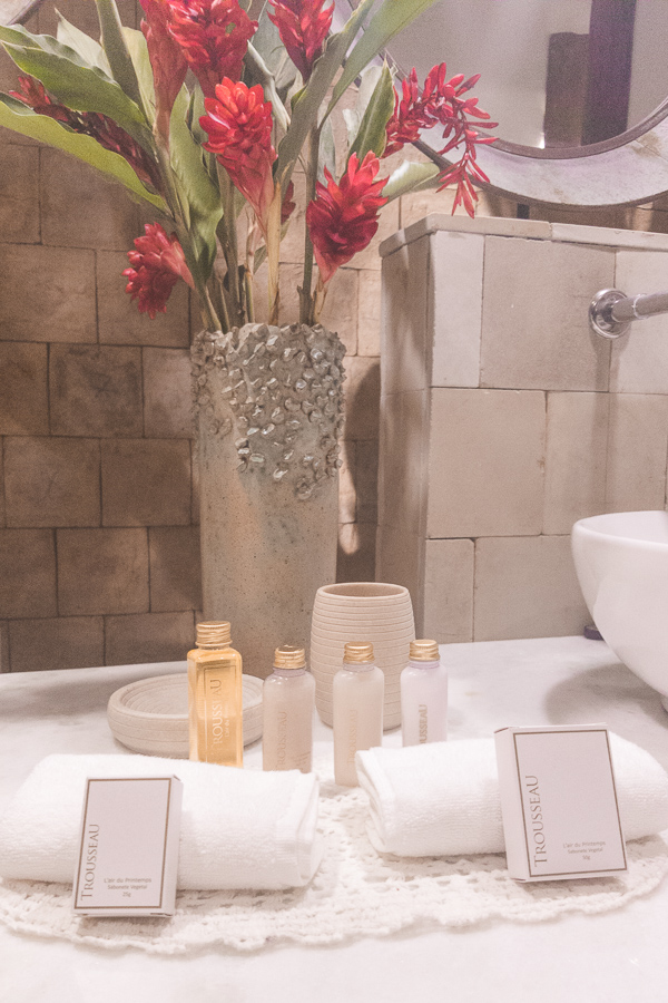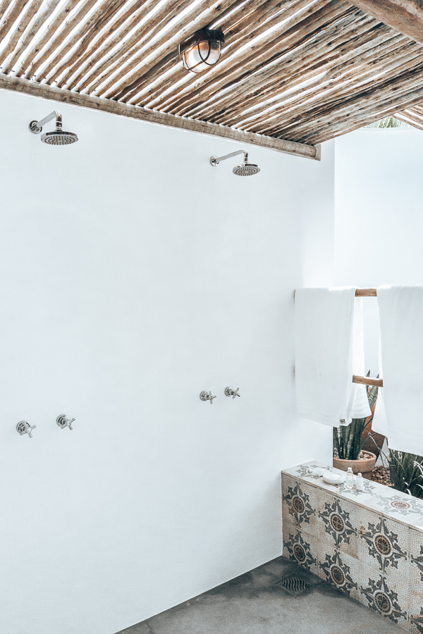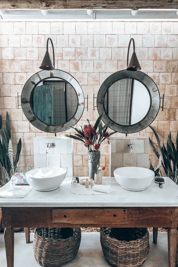O banheiro é todo branquinho, com pontos em madeira. Parece de filme. Lembrou muito as hospedagens de Tulum no México (clique aqui para ver). Têm duas pias, com espelhos individuais, sanitário separado e chuveiro duplo também. Sinceramente, moraria naquele banheiro – risos.