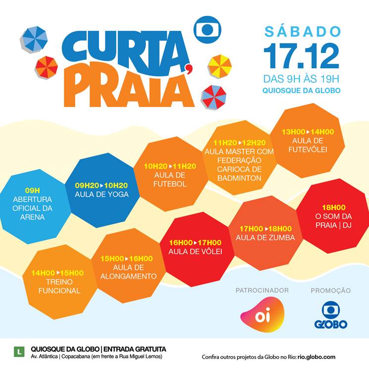 Neste sábado, dia 17, acontece a segunda edição do Curta, Praia, no Quiosque da Globo em Copacabana. Iniciativa da emissora com patrocínio da Oi, o projeto promove gratuitamente atividades esportivas e de qualidade de vida para toda a família. E o CASALVENTURA estará presente.