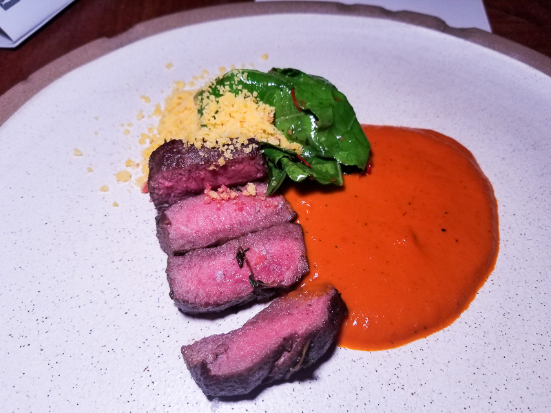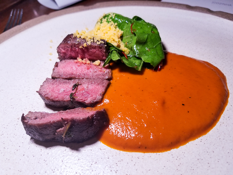 Vaca | pimentão | couve | farofa do chef Pedro. O corte da carne me surpreendeu por ser o “peixinho”, uma parte da dianteira do boi, muito saborosa, macia e quase sem gordura, que nunca tinha visto sendo apresentada em restaurantes. Estava deliciosa. Acompanhada por um creme de pimentão, couve e farofa, combinação perfeita.