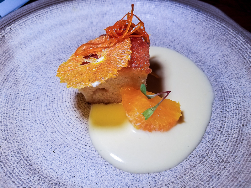 Tangerina do chef Pedro. A tangerina, fruta da estação, apresentada em diferentes maneiras. Bolo de Tangerina, Tangerina Desidratada, Tangerina in natura e mousse de maracujá. Simplesmente incrível essa combinação de texturas e paladares.