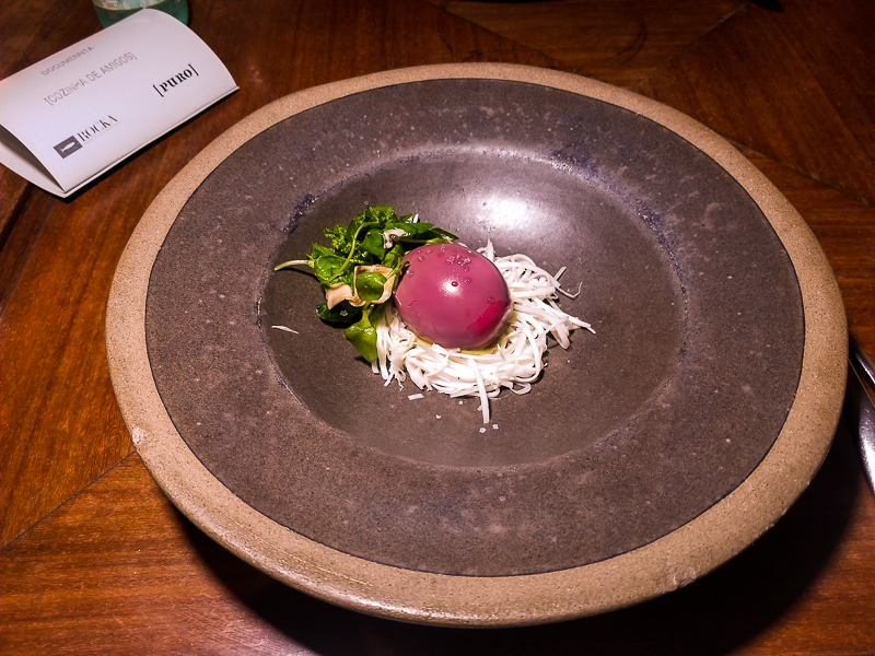 Primeira Entrada, chef Pedro Siqueira – Ovo | pupunha | ervilha | caldo. Vamos mostrar exatamente como o prato vinha descrito no menu, pois a ideia é justamente surpreender quando chega à mesa. Nesse caso chegou um Ovo Mollet curado em suco de beterraba, Pupunha Laminada e Caldo de Legumes. Ponto perfeito do ovo, com sabor suave e cor linda da beterraba. Começamos bem.
