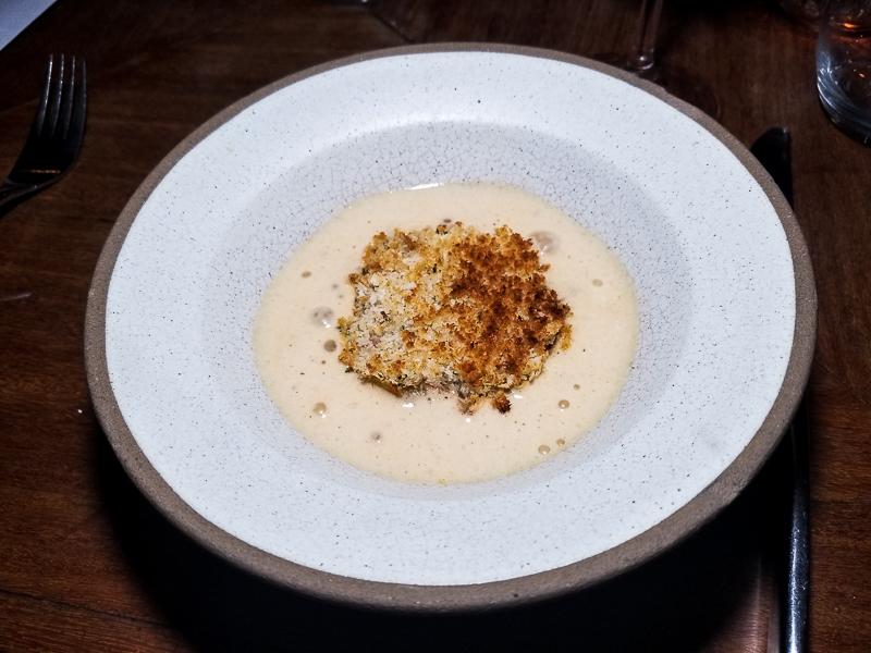 Segunda Entrada, chef Gustavo Rinkevich – Siri | espuma de Coco. Um clássico do chef Gustavo que apenas Camila experimentou (Eu, Thiago, sou alérgico.). Ela disse que estava muito saboroso e equilibrado, destacou a crosta formada também. Como sou alérgico, o chef Pedro preparou Lâminas de Namorado com Gazpacho e Vinagrete para eu acompanhar a sequência. Uma obra de arte, deliciosa.
