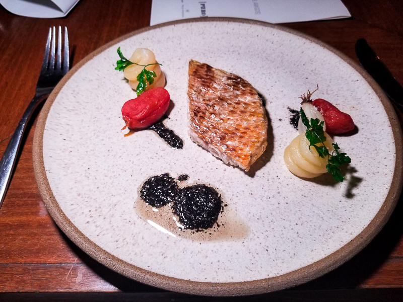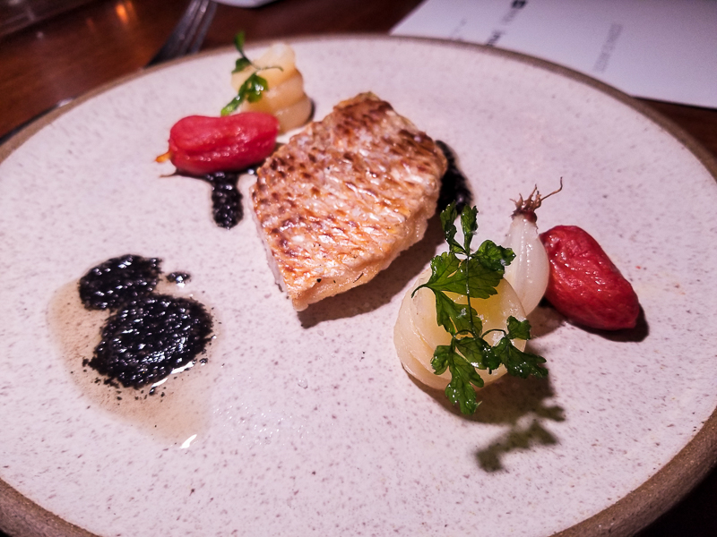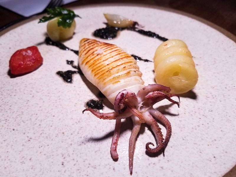 Lula| legumes | praliné de gergelim preto do chef Gustavo. Muito bem apresentado, pontos corretos e destaque para o praliné que estava bem saboroso. No meu caso ao invés de Lula (pois sou alérgico também) foi servido um Pargo. Mas Camila provou a Lula e adorou.