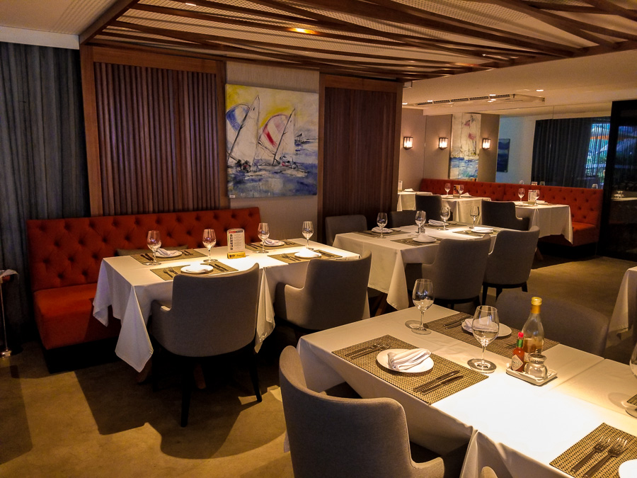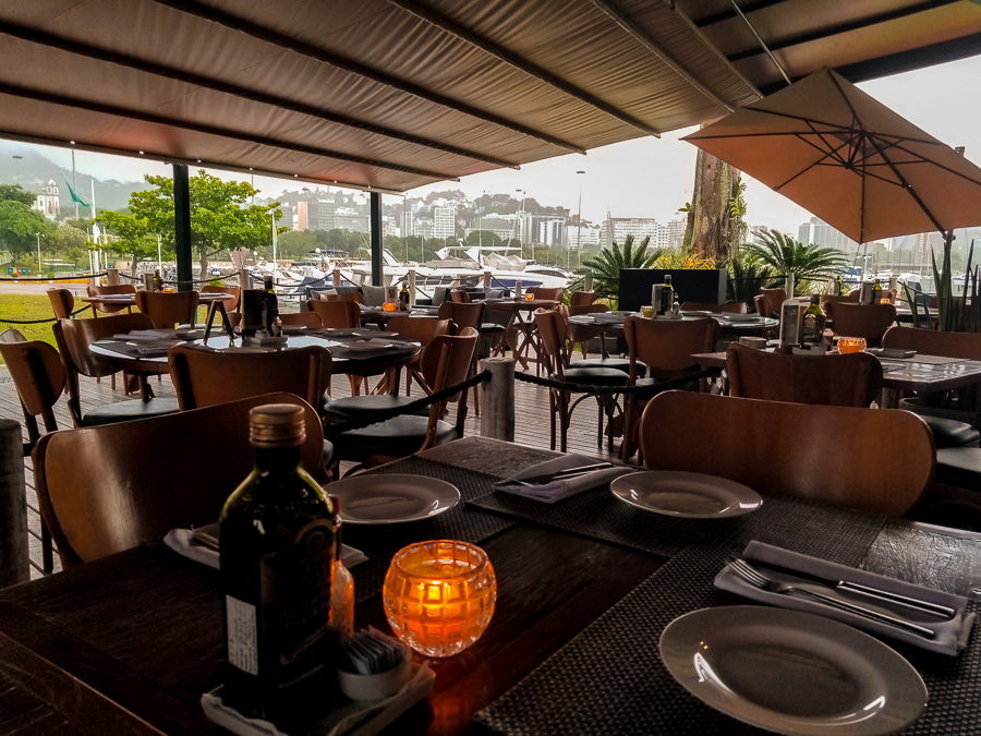 O restaurante é bem sofisticado e elegante. Possui um salão interno, um bar e uma varanda ampla com uma bela vista da Marina da Glória.