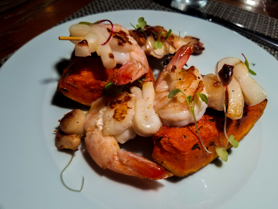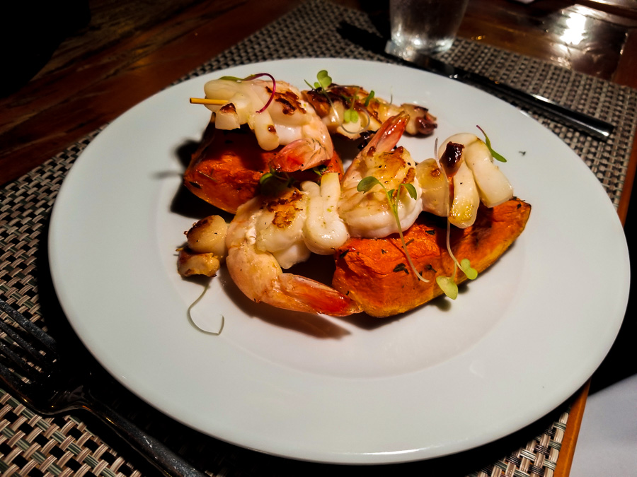 Para os pratos principais pedimos o Ossobuco com Risoto de Açafrão (R$79,00) e o Espeto Misto de camarão, lula e vieira com Abóbora assada em ervas (R$69,00).