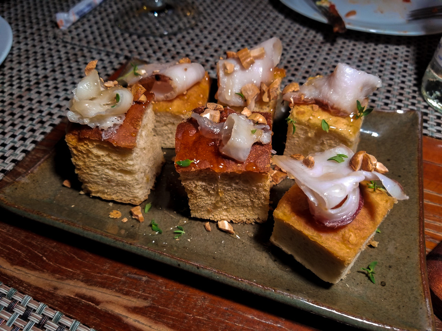 Da seção dos “Stuzzichinis” provamos a Focaccia Artesanal com Lardo (iguaria retirada da barriga ou costas do porco), mel e castanha de caju. Uma delícia! O lardo foi novidade para gente e adoramos. São 6 unidades por R$35,00.