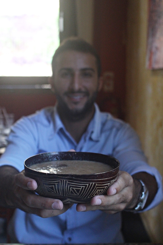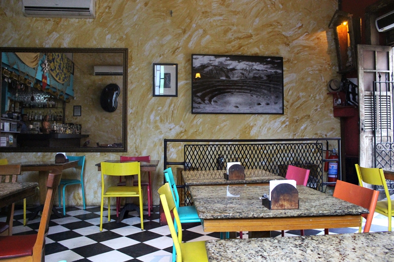 Ao chegar no restaurante nos deparamos com um ambiente rústico, bastante colorido, com muitos objetos de decoração indígenas, móveis em madeira reciclada que transmite um aconchego e uma certa informalidade característica do despojado bairro e do carioca também.