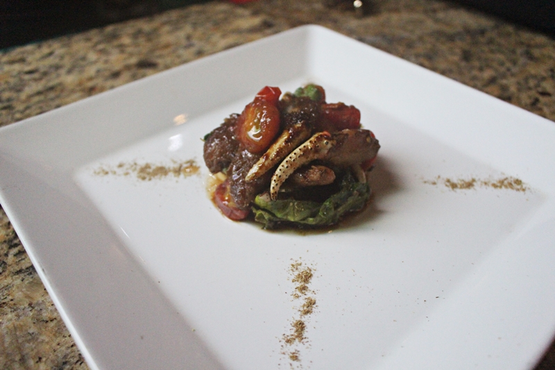 A outra entrada pedida foram as Patinhas de Caranguejo, patinhas de caranguejo de água doce salteadas com vegetais frescos, molho de ostra e redução de açaí branco (12 unidades). Outra delícia que é impossível comer só uma, duas, três.. ainda bem que vem 12!