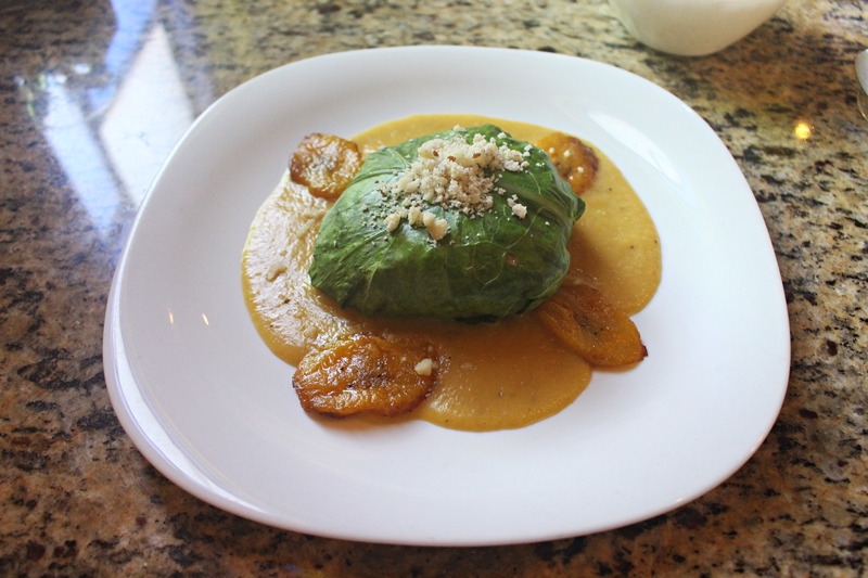 A primeira pedida foi o Peixe no Pacotinho, filé de tucunaré recheado com farofa de palmito de pupunha, servido empacotado em folhas, sobre creme de banana da terra levemente aromatizado com mangarataia. Acompanha arroz salsado e banana da terra frita. Ao abrir o “pacotinho” o aroma desse prato é indescritível de tão bom. E tudo se confirmar com um saboroso filé preparado no ponto certo, branquinho, suculento e muito bem acompanhado pela banana da terra. Seguramente um dos melhores pratos de peixe que já provamos.