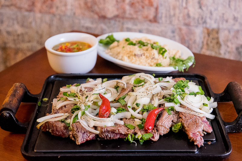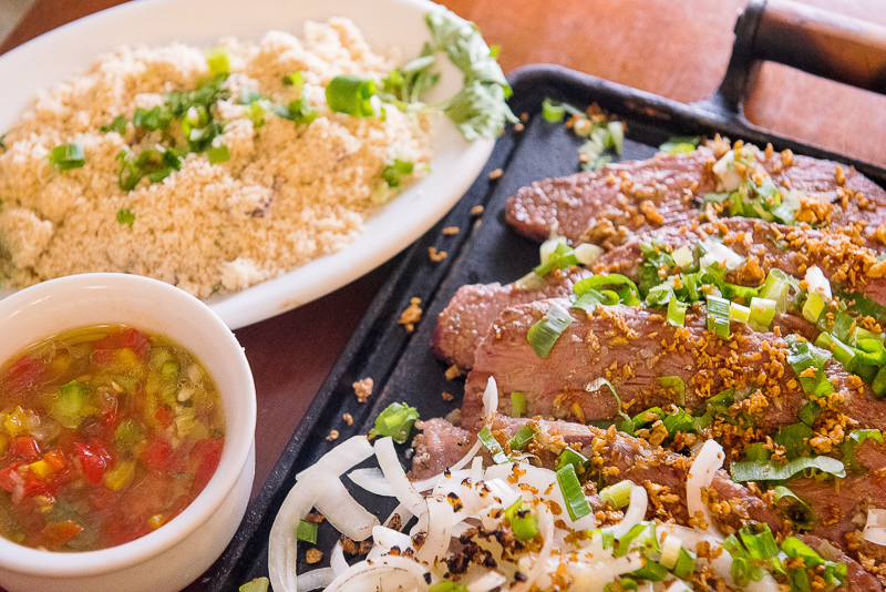 Após os pastéis, decidimos pedir uma das “chapas”, o carro chefe da área externa. Escolhemos a Chapa de Picanha Pequena, que está com desconto e saiu por R$69,90. Ela veio acompanhada de Farofa e Molho Vinagrete. Bem servida, deu para nós dois tranquilamente. A carne estava ótima, macia e suculenta. Adoramos.