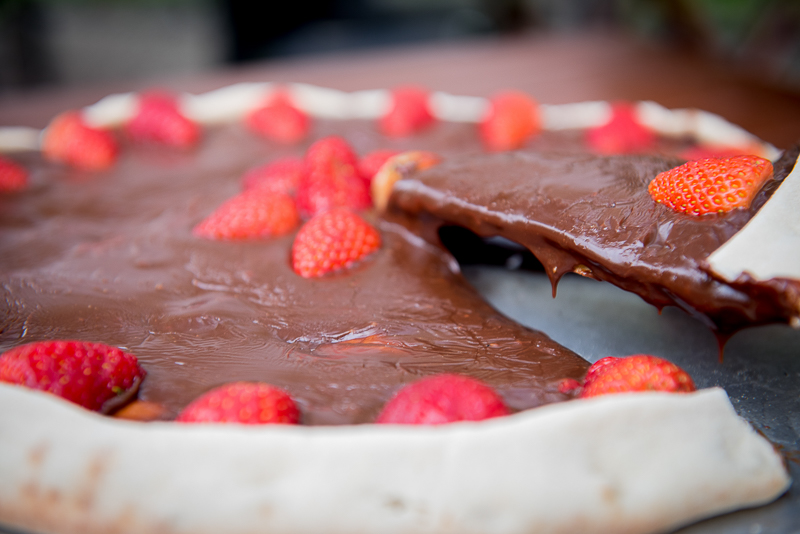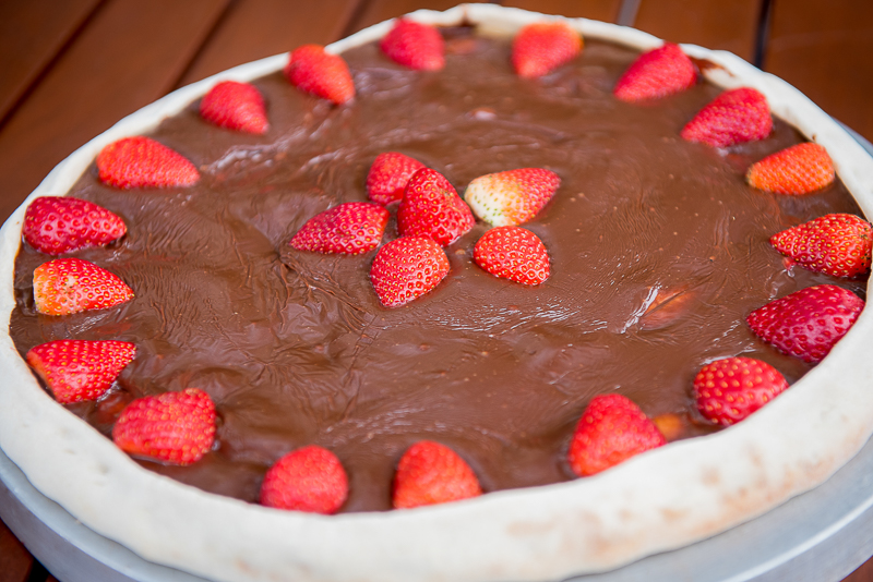 Para finalizar a noite não podíamos deixar de provar uma das pizzas feitas no forno a lenha. Pedimos de sobremesa uma Pizza Doce de Chocolate com Morango (R$49,90 o tamanho médio, que achamos grande). Uma delícia, parecia barra de chocolate derretida, muito boa. Não comemos tudo, mas levamos pra casa é claro.