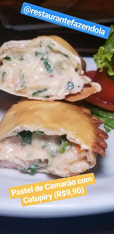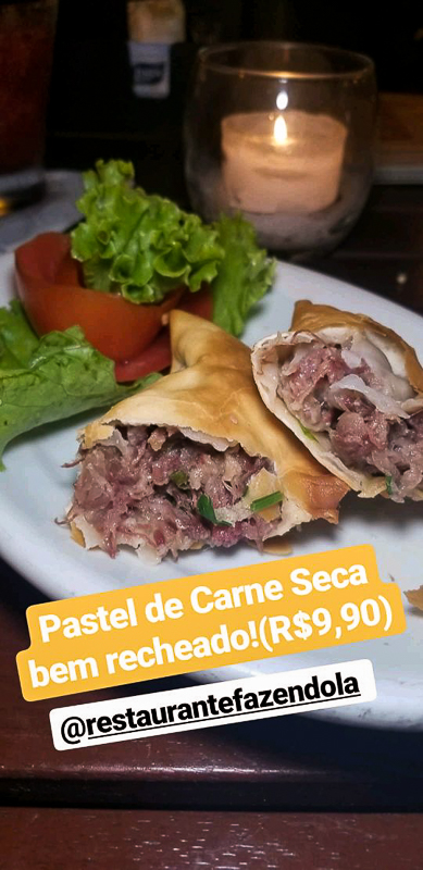 O cardápio da área externa do Fazendola prioriza os petiscos para compartilhar em um grupo de amigos, entre casais etc. Camila e eu começamos pedindo um pastel cada um. Ela pediu o de Camarão com Catupiry (R$9,90) e eu fui no de Carne Seca com Catupiry (R$9,90). Nos chamou atenção como ele vem sequinho e muito bem recheado! Estavam deliciosos.