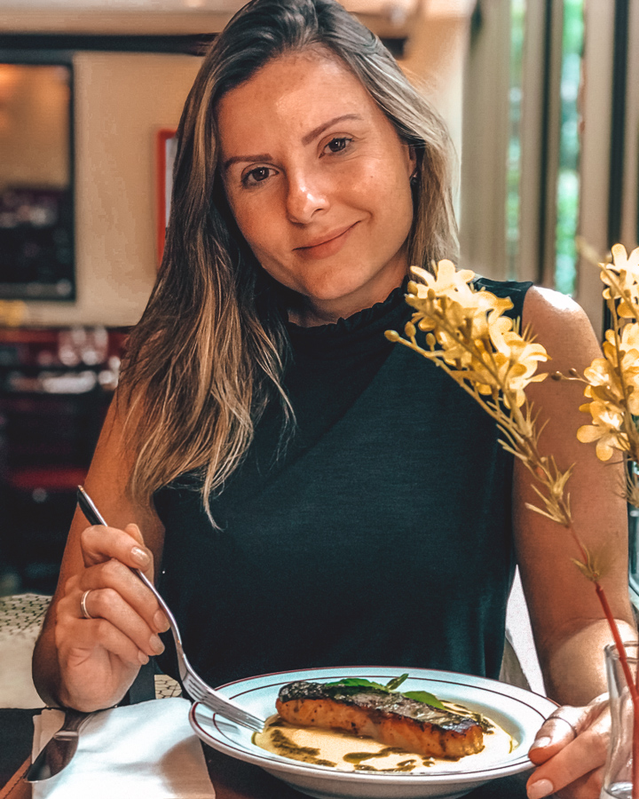 Em segundo lugar o Salmão Grelhado com Aligot (R$62,00). Mais uma vez o Aligot acompanhou bem a proteína, e essa, por sua vez, estava no ponto perfeito, saborosa e bem temperada. Vale ressaltar que ambos os pratos são bem servidos, então vá com calma nas entradas, pois ainda tem as sobremesas.