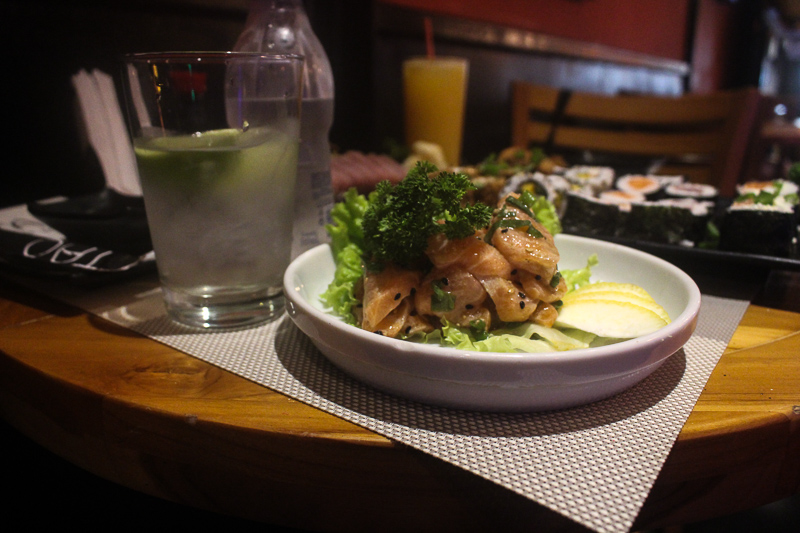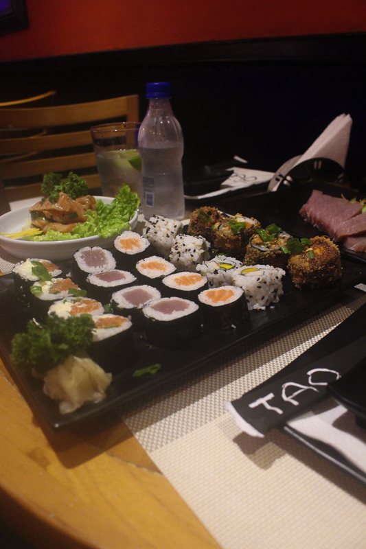 Além do combinado pedimos uma porção com 10 sashimis de atum, onde o corte da peça estava perfeito. Comentamos que nos surpreendeu pelo fato de o Tao Bar e Pousada não ser exclusivamente japonês em sua culinária, mas tudo foi explicado quando a chef nos contou que morou no Japão por 6 meses aprendendo a arte e se tornando uma sushiwoman de respeito! Adoramos.