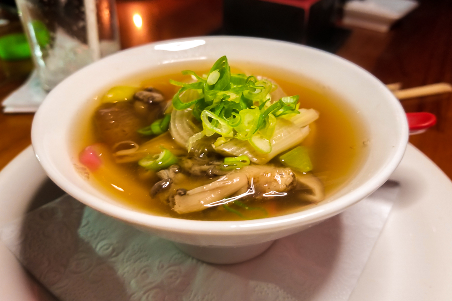 Em seguida provamos o Dobin Mushi (R$42), tradicional caldo japonês feito com frutos do mar e cogumelos. No momento em que se prova já é perceptível a quantidade de sabor e força do caldo. Surpreendeu!