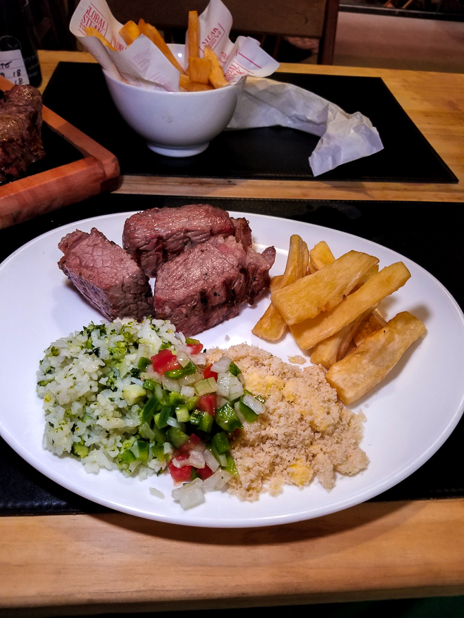 Camila e eu optamos pelo Bife de Chorizo Premium (um corte do centro do contra filé muito bom!). O preço do quilo desse corte sai por R$125,00. Como nossa peça pesou 800 g, o nosso custo final, somente com a carne, foi de R$100,00. Pode parecer muito, mas 800 g de carne servem tranquilamente 3 pessoas, ou até uma família de um casal e duas crianças! Para um corte com alto critério de seleção, achamos o preço justo. O preparo da carne já está incluso no valor.