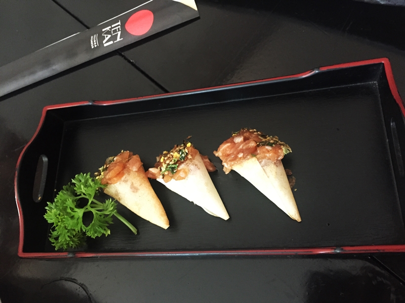 Furi Croc de Salmão – Tartare de salmão com flocos de raiz forte com casquinha crocante. Um mini cone delicioso e crocante!
