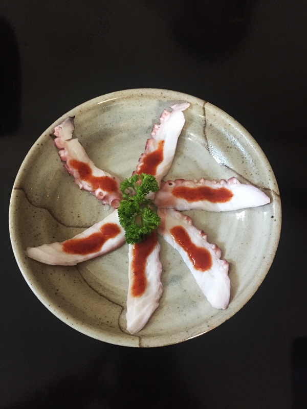 Tako Kimuchi – polvo com tempero picante. Finas fatias de polvo temperadas com Ichimi (pronuncia-se “itimí”), uma pimenta típica japonesa.
