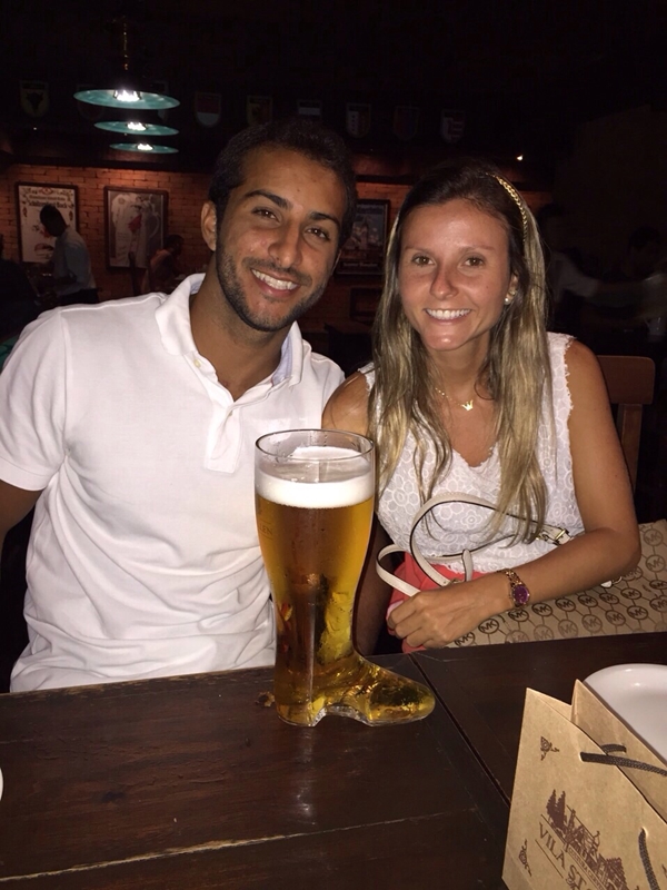 Assim que nosso pager vibrou fomos ao Harlekin Pub, sentamos à mesa e já pedimos um chopp na bota para dividir. São 1200 mL de chopp Therezópolis servidos numa bota de vidro. Vale a experiência. A saber, custa em torno de R$ 26, dependendo do chopp que você pedirá.